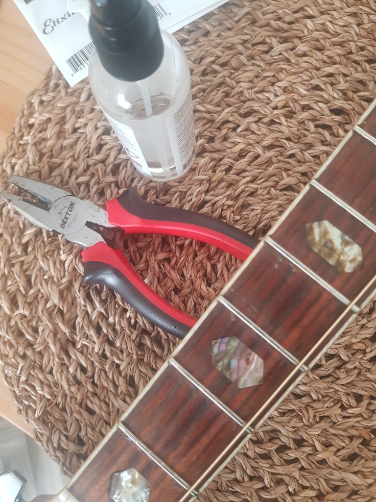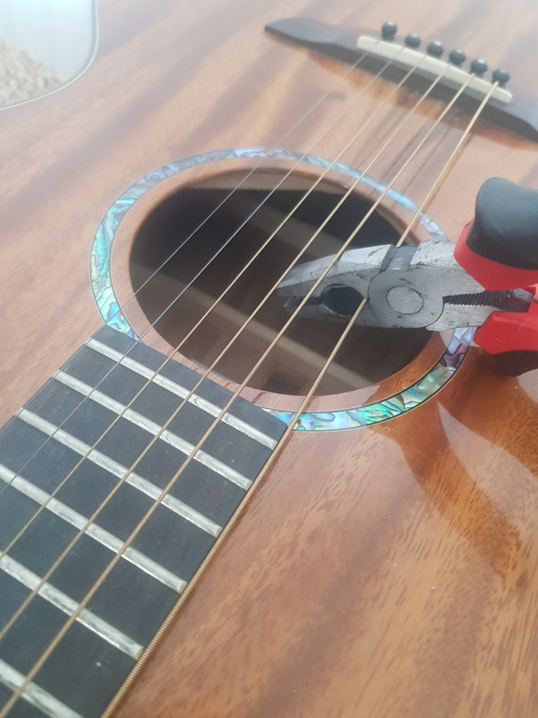 - Find some pliers. You’ll need these to cut off the old strings. Do this over the sound hole but only after unwinding them to give yourself some slack. It’s very important. You don’t want them ping in your face through the release of tension. (NB: You don’t have to take off all the old strings at once. if you don’t want to. Start with a couple so you can compare your new strings to the way the old ones have been put on, provided this was done correctly of course). You’ll also need these pliers to cut off the long dangly bits at the top of the guitar when you finish.